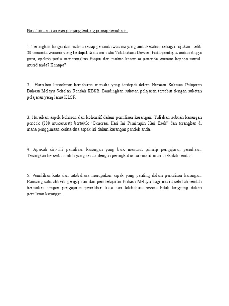 Bina Lima Soalan Esei Panjang Tentang Prinsip Penulisan Pdf